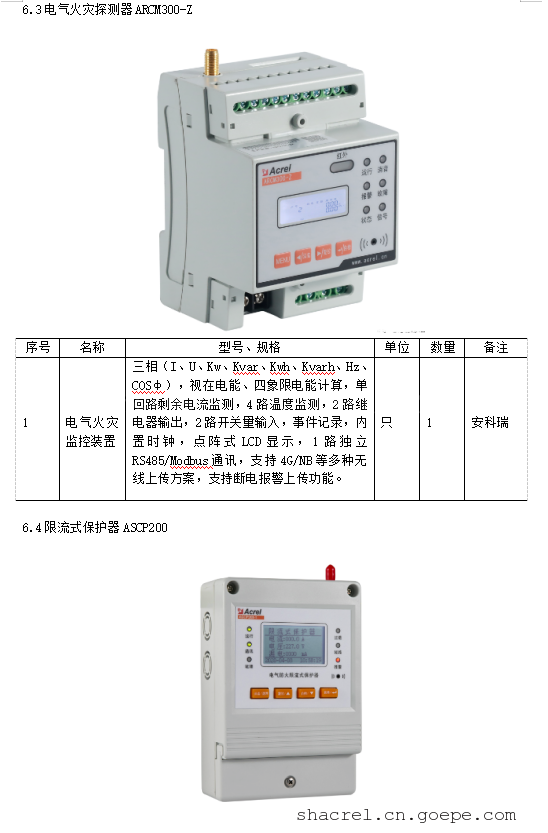 产品功能:项目 指标 输入电压 AC85~265V,45~65HZ 功耗 功耗≤5VA(无负载情况下) 额定电流 0~63A可设置 短路保护时间 <150μs 过载保护 动作范围:110%~140%;动作延时:3~60s 过压保护 动作范围:100%~120%;动作延时:0~60s 欠压保护 动作范围:60%~100%;动作延时:0~60s 线缆温度监测 监测范围 -20~120℃(精度±2℃) 报警设置 动作范围:45~110℃;动作延时:0~60s 漏电流监测 监测范围 20~1000mA(精度:±2%或±5nA) 报警设置 动作范围:30~1000mA;动作延时:0~60s 故障记录 20条记录(故障类型、故障值、故障时间) 报警方式 声光报警(其中声音可以通过消音按键消除) 通讯 1路RS485接口,Modbus-RTU协议;1路2G无线通讯