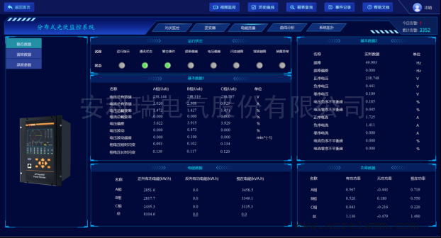 系统可以对整个供电系统的电能质量包括稳态状态和暂态状态进行持续监测,使管理人员实时掌握供电系统电能质量情况,以便及时发现和消除供电不稳定因素。在供电系统主界面上应能实时显示各电能质量监测点的监测装置通信状态、各监测点的A/B/C相电压总畸变率、三相电压不平衡度百分比和正序/负序/零序电压值、三相电流不平衡度百分比和正序/负序/零序电流值。