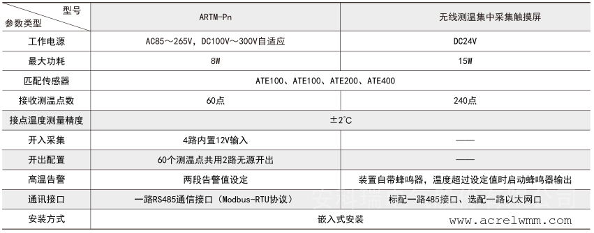 ARTM-Pn无线测温装置:ARTM-Pn无线测温装置可以单独安装在高压柜、低压抽屉柜内,每台装置可以接收18个传感器的数据,传感器型号可选配ATE100、ATE200、ATE300。装置带有一路485接口,可将采集到的温度数据上传到监控中心。